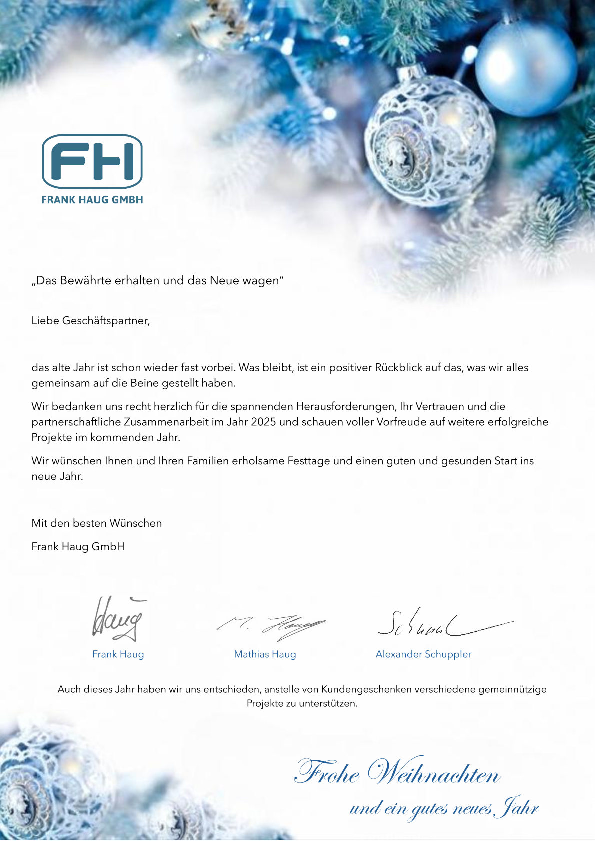 Auf eine erfolgreiche Zukunft und spannende gemeinsame Projekte! Ihr Team der Frank Haug GmbH